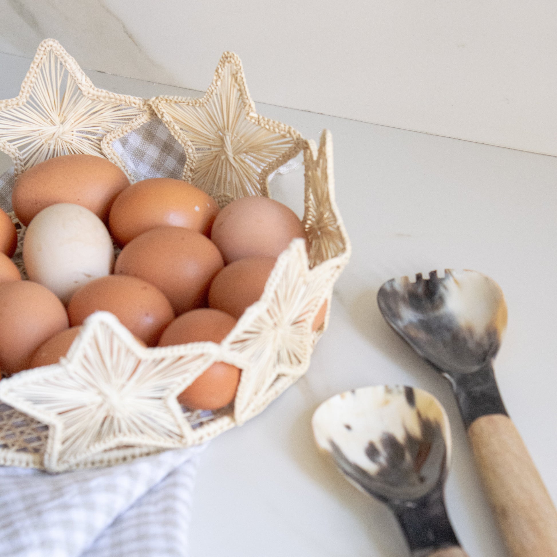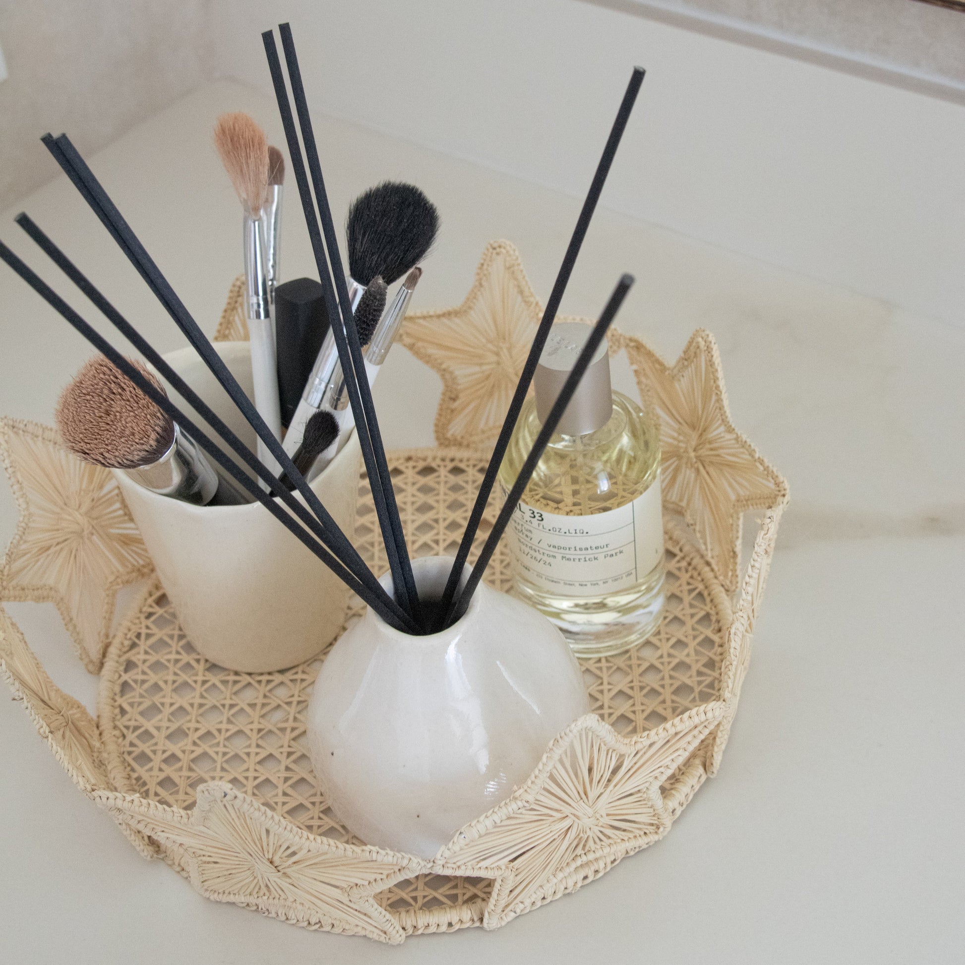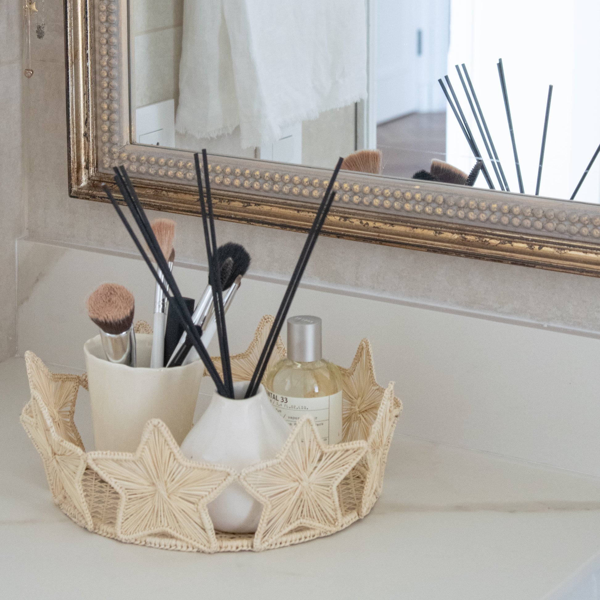 La Bandeja Morpho es pequeña, liviana y 100% única. Hecha en fibra de palma, con detalles de estrellas que le dan personalidad, es perfecta para cualquier espacio: baño, cocina, habitación o la pieza de tu guagua. Chic, artesanal y ultra versátil.