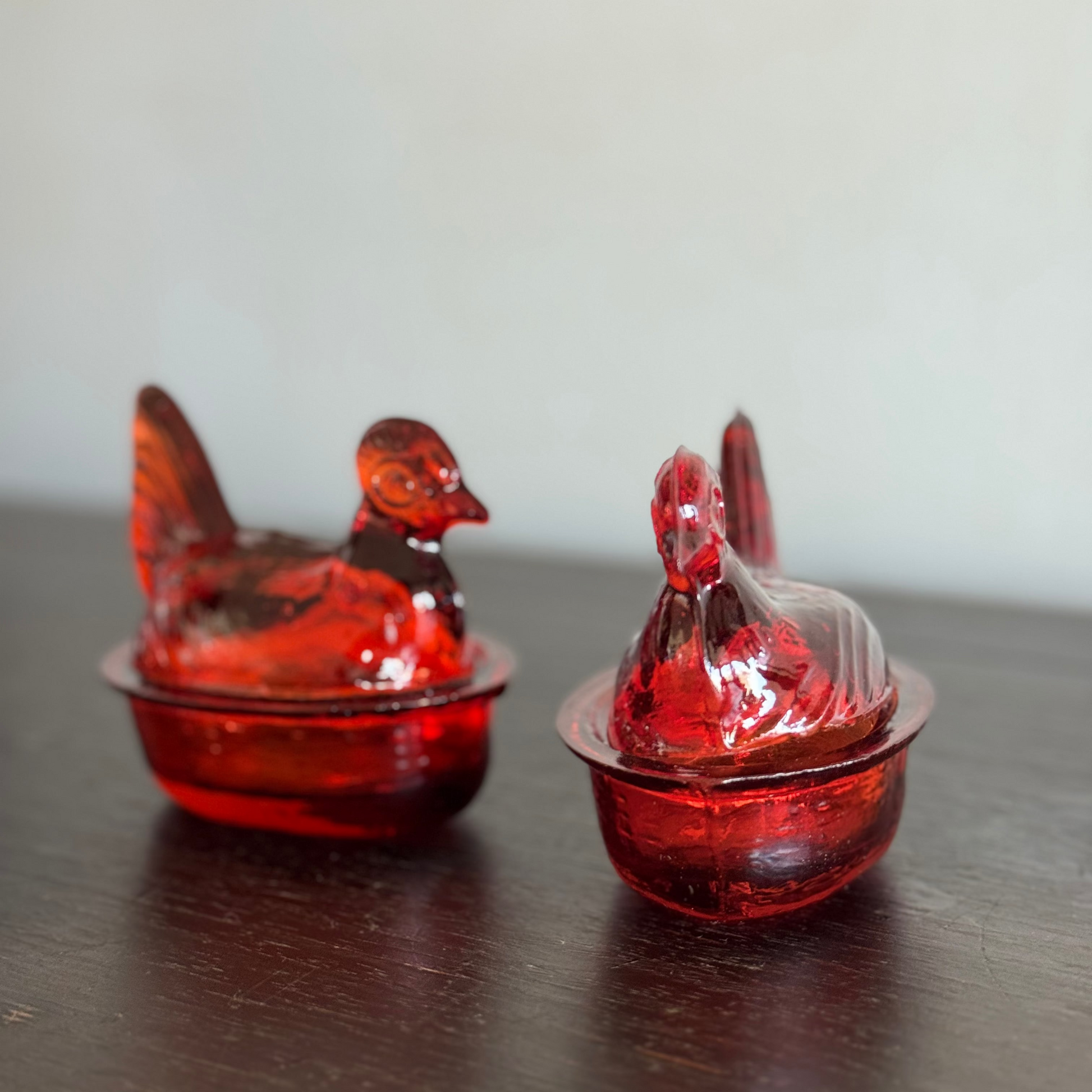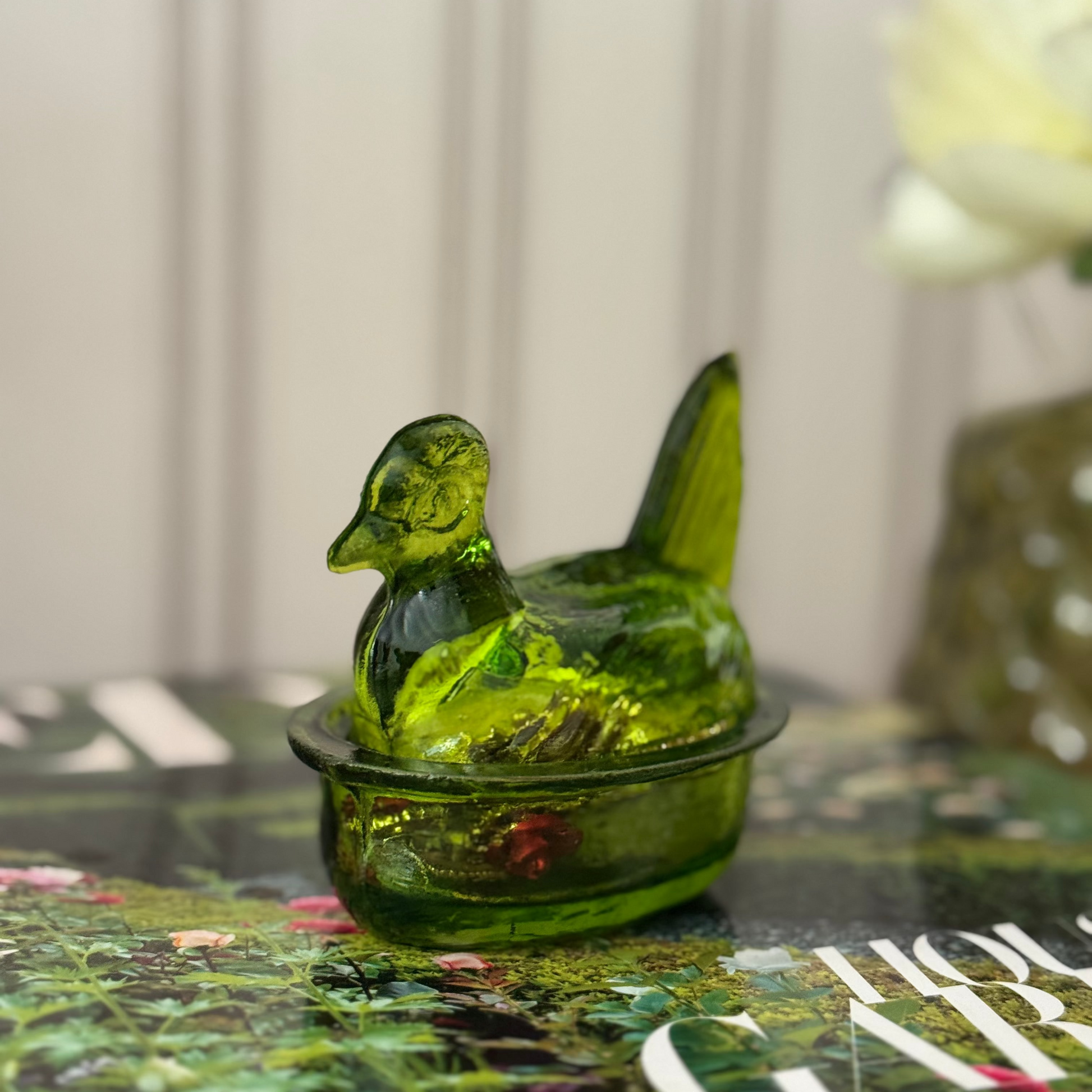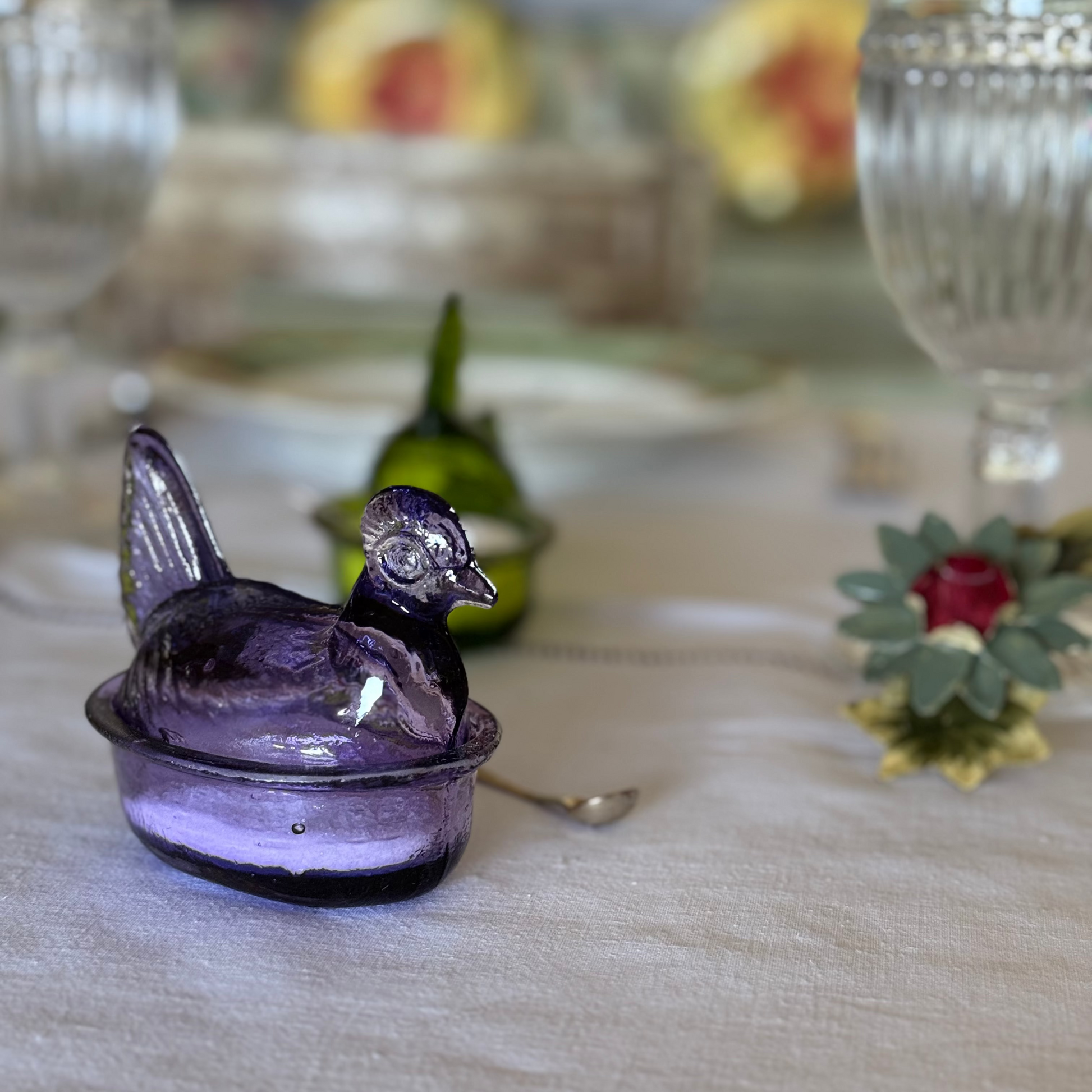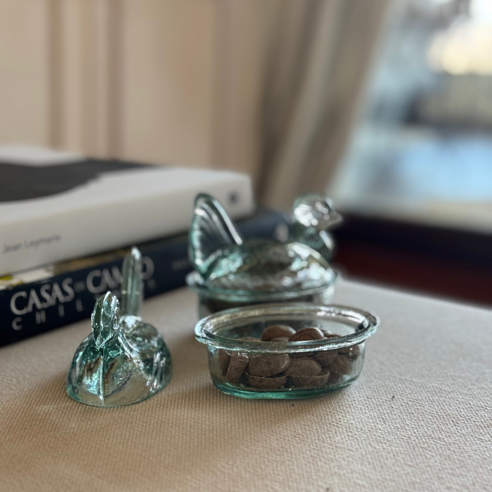 Contenedor de vidrio soplado en forma de gallina, hecho a mano por artesanos colombianos. Ideal como salero, contenedor para tu velador o lo que quieras, aportando un toque único y artesanal a tu casa.